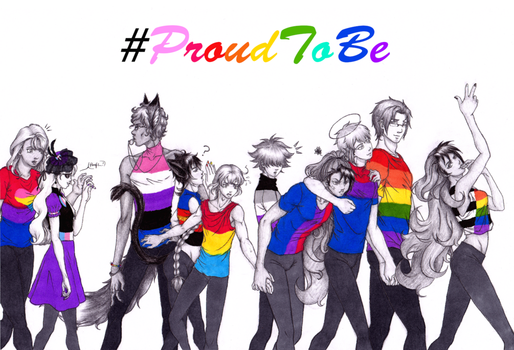 A traditionally drawn print made to celebrate LGBTQ+ Pride; made, scanned and edited by me of 10 of my own characters, (right to left) Kosuke, Satoshi, Angello, Daisuke, Umeko, Yuki, Sonny, Ryker, Ella & Terra. (drawn in my own style).